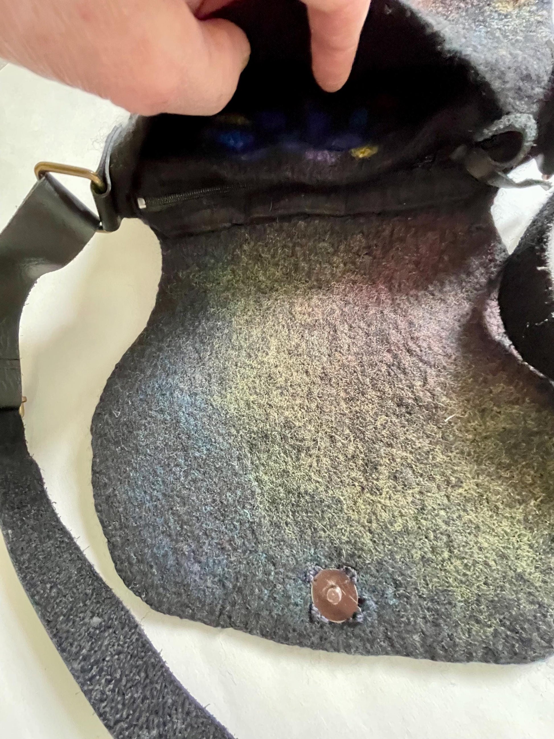 This handbag is a unique blend of style and practicality. Wet felted with merino wool and silk, the lightweight quality belies a sturdy beauty. The strap is a black leather clip on adjustable strap and there is an inner zippered full sized pocket to keep smaller treasures safe. Wear this slung over a shoulder or across your body to carry your treasures.