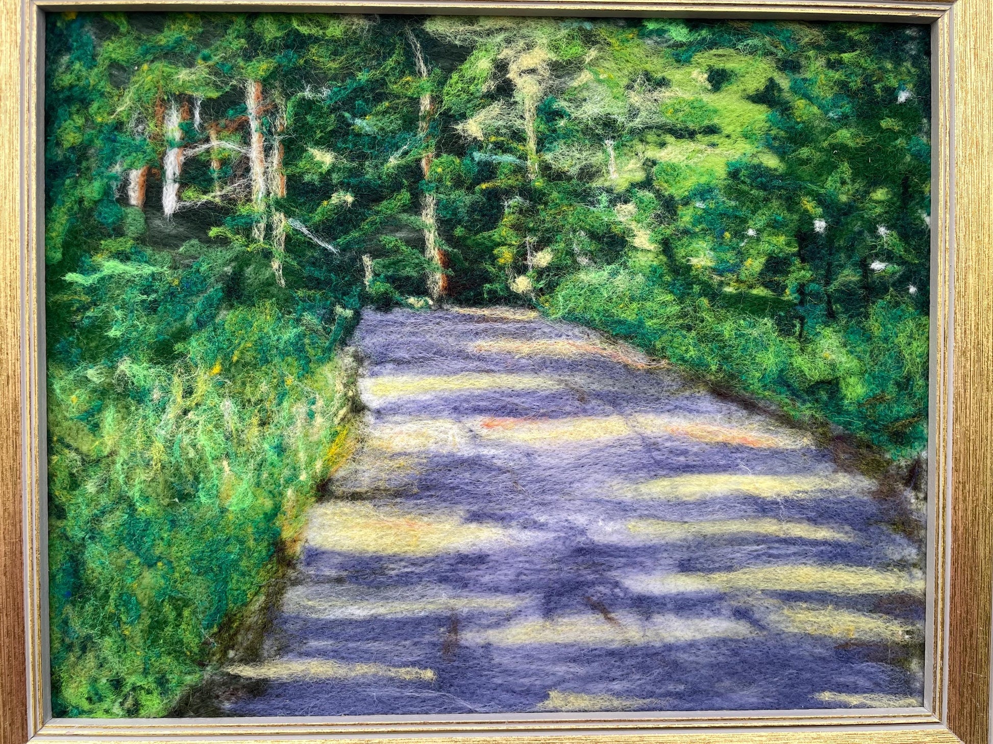 This is a wool felted painting of a road by my house. I was struck by the light, even though the trees were fully leafed out. This was entirely needlefelted applying my colored wool “fluff” like paint with special felting needles until everything lay blended and smooth.