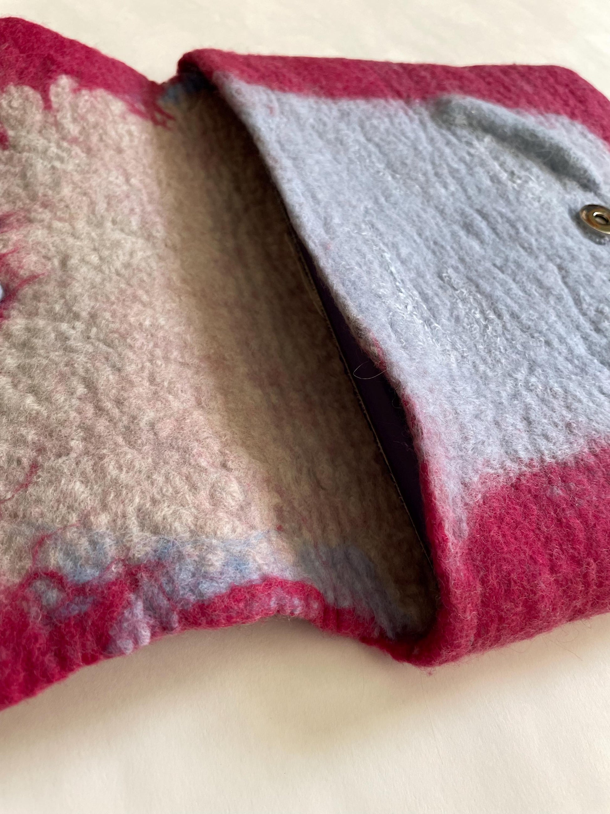 This is a stunning and interesting tablet case that I felted with an ultrasoft merino wool and added inclusions and cut outs in the wool as well as a clever magnetic closure to add interest and beauty. The result? A luxuriously beautiful and soft way to carry your electronics, your books or other treasures. The closure is a secure magnetic clasp. Size : 10” W x 8”H with a 4” flap