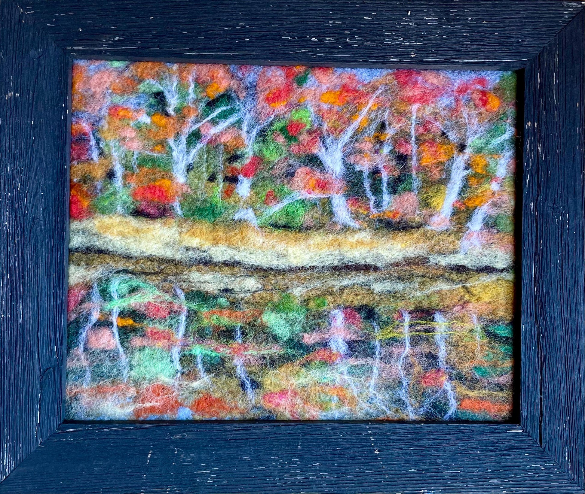 This is a wool felted painting of an Autumn display in its full glory reflected in the lakeside water. This was entirely needlefelted applying my colored wool “fluff” like paint with special felting needles until everything lay blended and smooth.